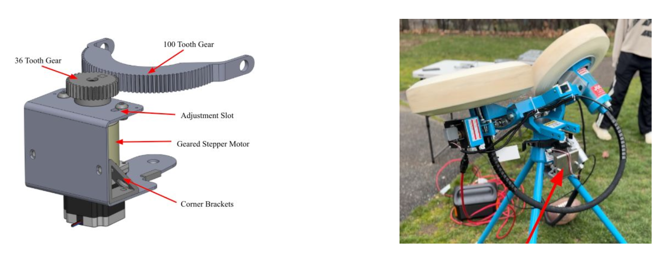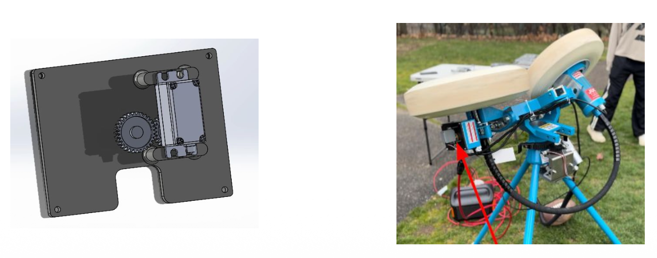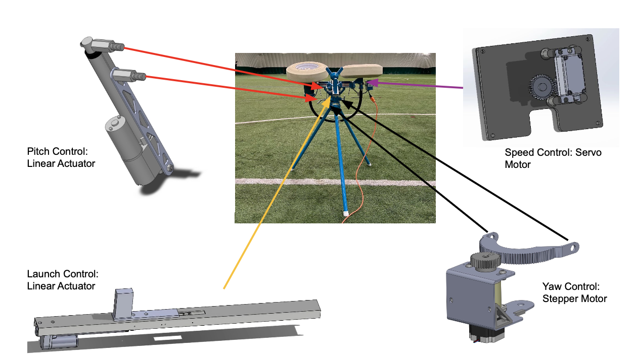 This project was my senior design capstone project. Our goal was to create an automated football passing machine that allows receivers to train on their own, maximizing practice time and improving their catching skills. To achieve this, we started with the industry-leading JUGS machine and added automated pitch, yaw, speed, and firing systems, enabling accurate targeting and consistent delivery of footballs to predetermined spots on the field. The original pitch adjustment was replaced with a linear actuator capable of raising and lowering the machine. A second actuator was added to automate the firing mechanism, mounted beneath the existing firing mechanism with precisely positioned linear bearings. Automating the yaw mechanism proved to be the most complex challenge. Our design used a custom adapter plate that mounted gear fastened to the base. A small servo was used to control the launcher wheel’s RPM. All motors and sensors were connected to an Arduino Mega, which served as the central controller and processor. Plays could be preprogrammed with a timer or triggered remotely from the field. each modification was designed as a bolt-on component with straightforward assembly steps, allowing the system to be marketed as an affordable upgrade kit to the machine priced at $500 or less.